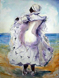 Bomba is a dialogue between the dancer and drummer.10 It starts with a female soloist called called "laina" who "sings a phrase evoking a primitive call".11 The drummer plays a rhythm and the dancer responds in a "freestyle" manner while swishing their skirts around". Men usually wear all white and fedora hat and women wear plantation shirts and a head scarf.12 Men and women both participated in this dance, but do not dance in a partner form or touch at all. “After the abolition of slavery, in 1873, the free slaves and their descendants followed the tradition of La Bomba as a social activity."13 It eventually went from a dance of the slaves to a dance adopted by popular and upper classes. But there was still a rift between lower and upper classes. “At least until the 1840’s, the island’s dances were divided into two types: one known as the bailes de sociedad , or high society, which consisted of adaptations of polkas, waltzes, and other European dances, and the bailes de garabuto, the popular dances."14