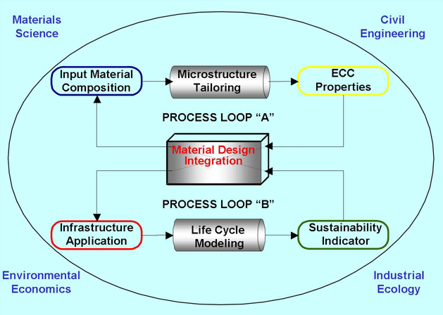 In cooperation with the University of Michigan Center for Sustainable Systems, the ACE-MRL is currently developing and refining a revolutionary design schematic incorporating material science, geology, civil engineering materials, structural engineering, transportation engineering, hydraulics engineering, social science, public policy, and life-cycle analysis to promote the design of new materials and infrastructure which incorporates sustainability considerations as a primary design concern. Working within the integrated materials design schematic, once new materials are developed, they are evaluated for traditional engineering performance, along with environmental, social, and economic metrics to determine lifetime performance and sustainability. These results are then used by materials engineers to refine the material for higher long term performance. Through this unique iterative process, new materials are introduced which are optimized for engineering performance and sustainability concerns. This methodology looks to revolutionize the way in which future materials are developed and infrastructure is designed.