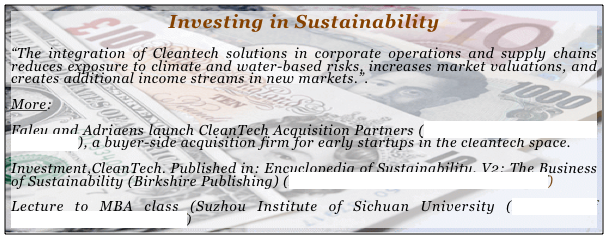 Sustainability is becoming a differentiator for corporations and global economies, venture investment in CleanTech companies is going strong (link), and CleanTech private equity firms are emerging. Witness the innovations in greening supply chains, and the design of sustainable products and services in the US and in emerging markets.