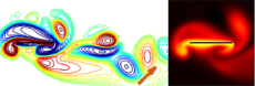 as an attracting state for a free flapping body PNAS, 2005, 102 (32), 11163-11166; S. Alben and M.J. Shelley. We study numerically a fluid flow problem at the transition between low and high Reynolds number locomotion, motivated by an experiment at the Courant Institute Applied Math Lab. In our study, a 2-D rigid body is flapped in the vertical direction and is free to move horizontally. Above a critical flapping frequency, the wing becomes unstable to horizontal motion. For certain ranges of wing shape and mass, this instability saturates to unidirectional flapping flight. We have found that the typical event which triggers "take-off" is a fortuitous collision of the body with vortices shed on previous flapping strokes. Dynamics of a free flapping body Take-off (.mov) Take-off (.avi) Back-and-forth (.mov) Back-and-forth (.avi) Chaotic (.mov) Chaotic (.avi) Thin body (.mov) Thin body (.avi) |