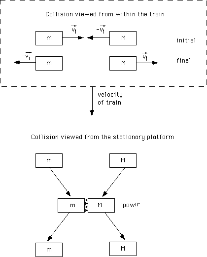 Figure 2: The special elastic collision in a moving train as viewed from the station platform.