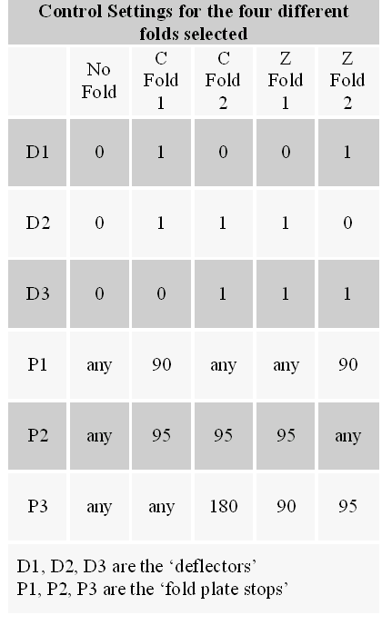 Objective The purpose of this exercise was to redesign the control settings of a Pitney Bowes Paper Folder Module: Model F402. In its current design the paper folder can make eight different kinds of folds, or allow paper to pass through it unfolded. It accomplishes this by using ‘fold rollers’ to move paper along ‘fold plates’. The three fold plates have ‘fold plate stops’ to control the length of the folds. Three ‘deflectors’ are used to control which of the three fold plates the paper can go into. In all there are six controls that have to set by a user before operating the machine.