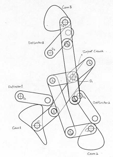 Proposed Mechanism Design A linkage mechanism is proposed, which if incorporated in the machine’s design, reduces the number of controls to be adjusted by the user. Three four-bar mechanisms with a common crank are used to set the deflector positions. Since the mechanism has one d.o.f, a single input is required to adjust these three controls. Furthermore, it is observed that for a standard size paper, two of the paper stop knobs can be semi-permanently fixed. The third one is actuated by means of a four-bar function generator. As in the previous case, this mechanism also requires a single input. The inputs to the above two mechanisms are made common so that there is only one input crank for the entire mechanism. Thus the overall mechanism has a single degree of freedom and requires only one setting for selecting a paper fold type. This single input is placed as a knob on the front panel. As is evident, the number of control inputs has been reduced from six to just one. The desired task is thus accomplished. A figure of the multi-loop mechanism is presented.