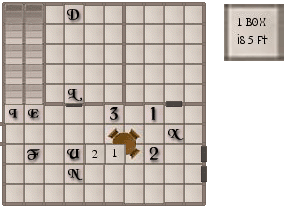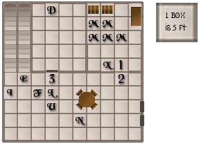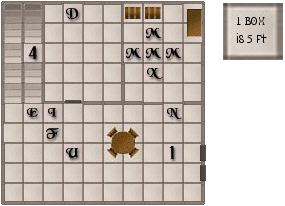 Day 8, 16 Wealsun 579 Scenario: The party has come across a tower in the Kron Hills which they suspect is the lair of the bandits. After dispatching two goblins on the roof of the tower, they have made their way down to the lower level, bypassing a sleeping human on the upper level. Three men and two goblins are at a table playing cards, when Xilo brazenly walks over to the centermost man and tries to bluff him into giving up the traitor Chert. The bandit, quite perplexed as to the identity of the newcomers, overturns the table and draws steel! As combat breaks out Learna looks at the enemy and barks, "Thuranzi." Small tattoos of what look like tiny black dragons spread out on her pale skin. Nix seizes the advantage and mercilessly leaps at the goblin before him. The halfling connects with both blades; the first a hack to the side with his short sword, the second a life-ending stab with his dagger. The goblin underneath the table tries to wriggle free as he watches his mate's corpse land beside him on the floor. Xilo dodges around the bandit before him and lowers his shoulder at the easternmost door. The unlocked portal gives way to his momentum and bursts inward. Standing in the middle of the room are five short, black-robed men that seem to blur and fade as they circle one another. Seeing Xilo enter, they all sneer at the paladin and bring their quarterstaves into a defensive position. Lilly sets bullet to leather and begins whirling her sling. As the whip-wielding menace of a man thought to be Lugwar enters the main chamber, she lets loose with her projectile. Unfortunately, the bullet bounces harmlessly off his bloody leather jerkin. The man peers balefully at the druid, but steps up to engage young Lubhan. With a swift motion, he cracks the whip and manages to wrap it around the young warrior's leg. With a swift tug, he pulls Lub's leg out from under him and sends him to the floor. The bandit closest to Lub jumps at the opportunity to attack his prone opponent but somehow still manages to miss. The other two bandits step toward Xilo, the nearest one following him into the room to attack. Xilo manages to block the bandit's attack with his shield, however, as he takes a position keeping all opponents in front of him. Lub manages to untangle the whip from his leg and quickly returns to his feet, holding his buckler before him in defense. Watching the battle unfold from the stairway, Learna chants in the arcane tongue as she waves her hands rhythmically. What looks like a small black dragon flies from her outstretched fingers and strikes the huge bandit. The five black-robed men in the northeastern room chant in unison. Upon the completion of their spell, two bolts of glowing energy shoot forth and strike Xilo, who winces at the pain. Nix steps up to the pinned goblin and with one swift stroke ends the helpless creature's miserable life. Suddenly finding himself facing six opponents, with five of them being obvious spellcasters, Xilo shouts for help as he launches himself at the bandit in the doorway, being sure to leave his back to the wall. His blade sinks deep, opening up a grievous wound in the bandit's side. The man stumbles back against the ruined door but manages to retain consciousness. Seeing no real opening past the enormous Lugwar, Fyen instead engages the man from his side, hoping to slide past next round and check on the chained dwarf. His quarterstaff lands true and the man lets out a gasp of breath, signaling the effect the shaft of wood had on him. Lilly tucks her sling back into her pouch and gets a firm grip on her quarterstaff. She checks back up the stairs, but doesn't notice any activity. Lugwar plies his whip again, this time wrapping it around Fyen's leg and pulling the priest to the floor. The nearby bandit dodges around his large companion and stabs at the prone Fyen, again missing, though just barely. He lets out a curse that seems to include the priest's mother. The barely conscious bandit manages to sneak his short blade past Xilo's defenses, cutting the armorless paladin's thigh. The third bandit stays just outside the doorway in the main room, keeping an eye on both combats, watching for an opening. Learna stretches forth her right hand and chants a few arcane words. Her hand glows blue for a second and then fades as a blue tattoo of a dragon appears on her palm. The eyes of the dragon blaze as a beam of bright blue light shines forth and strikes the Lugwar, who shivers in pain. The short, black-robed mages again chant in eery unison as they gesture wildly. A black beam of un-light streaks forward and hits Xilo. The paladin does not seem to be injured, but his shoulders sag and he seems to have some trouble lifting his weapon. Nix works his way around the overturned table and launches himself at the bandit in the doorway. With great agility, the man sidesteps the halfling's twin blades. Despite his adverse condition, Xilo launches himself at the central shifting, blurry mage. His longsword strikes true, but to his astonishment, the mage simply disappears. Fyen regains his feet and attempts to return the favor to Lugwar. He manages to hit the big man on the calf, but Lugwar grabs the staff and simply overpowers Fyen and sends him back to the floor. Lilly moves into the room being careful to leave the stairs within her line of sight. Finding a spot between Lub and the prone Fyen, she jabs her quarterstaff into Lugwar's ribs, knocking the wind from the big man's lungs. He crumples over into unconsciousness. The bandit sees Lugwar go down and swings his short sword furiously at Fyen's prone form. He finally manages to draw blood, and Fyen joins the hulking man next to him in unconsciousness. The bandit on Nix stabs at the halfling but is far off the mark. Seeing his leader threatened by Xilo, the last bandit ignores the paladin's warning and charges his back. Fortunately, he is too weak from blood loss to land a blow. Lub attacks the bandit standing over Fyen a