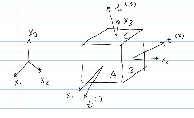Note that since we are dealing with continuum mechanics, we assume that the volume of the cube can be sequentially shrunk down to a point, if the volume is homogeneous. In reality, this is generally not the case, especially in biologic tissues. However the concept of stress so defined is still very useful for engineering analysis of tissue mechanics. More advanced concepts of multiscale continuum analysis are considered in the advanced course BME 456.