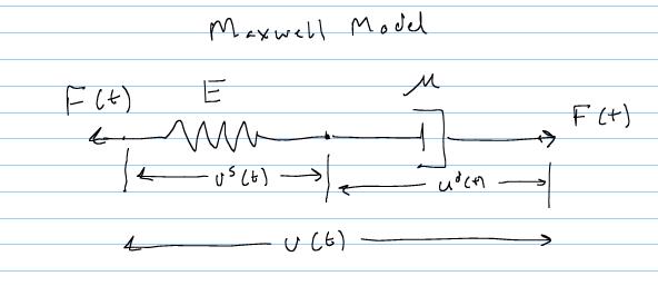 This combination is known as the Maxwell model. As we will see, this model actually represents a fluid since it relaxes completely to zero stress and undergoes creep indefinitely. To derive the constitutive relation, we note first examine the kinematics of the model. It is clear from the geometry of the model that the total displacement will be the spring displacement plus the dashpot displacement: