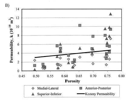 Thus, using this approach, Kohles and Roberts could determine some constants for linear poroelasticity theory as applied to cancellous bone, in this case from the bovine (cow) distal femur. Results showed that, as expected, increasing elastic modulus was correlated with decreasing permeability: