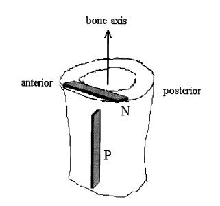 where E0, A1, b, and g are experimental constants to be determined and t1 and t2 are characteristic relaxation times which must also be fit to data. In this case, Iyo et al. divide the response into a fast relaxation process (associated with A1) and a slow relaxation process, (associated with (1-A1)). Iyo et al. tested cortical bone specimens from bovine distal femur as shown in the following orientation: