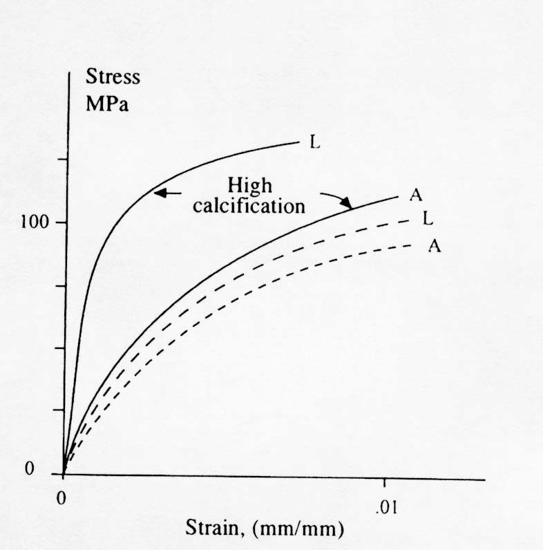 The terms longitudinal and alternating refer to how the collagen fiber bundles are oriented with respect to the plane of the osteon section. Notice that collagen fiber bundles oriented with the direction of testing produce a higher normal stiffness while collagen fiber bundles oriented out of the plane of testing produce a lower normal stiffness but a higher shear stiffness. Ascenzi also reported the affect of mineralization on the properties of these different types of osteons. The effect is illustrated in the stress strain diagram below: