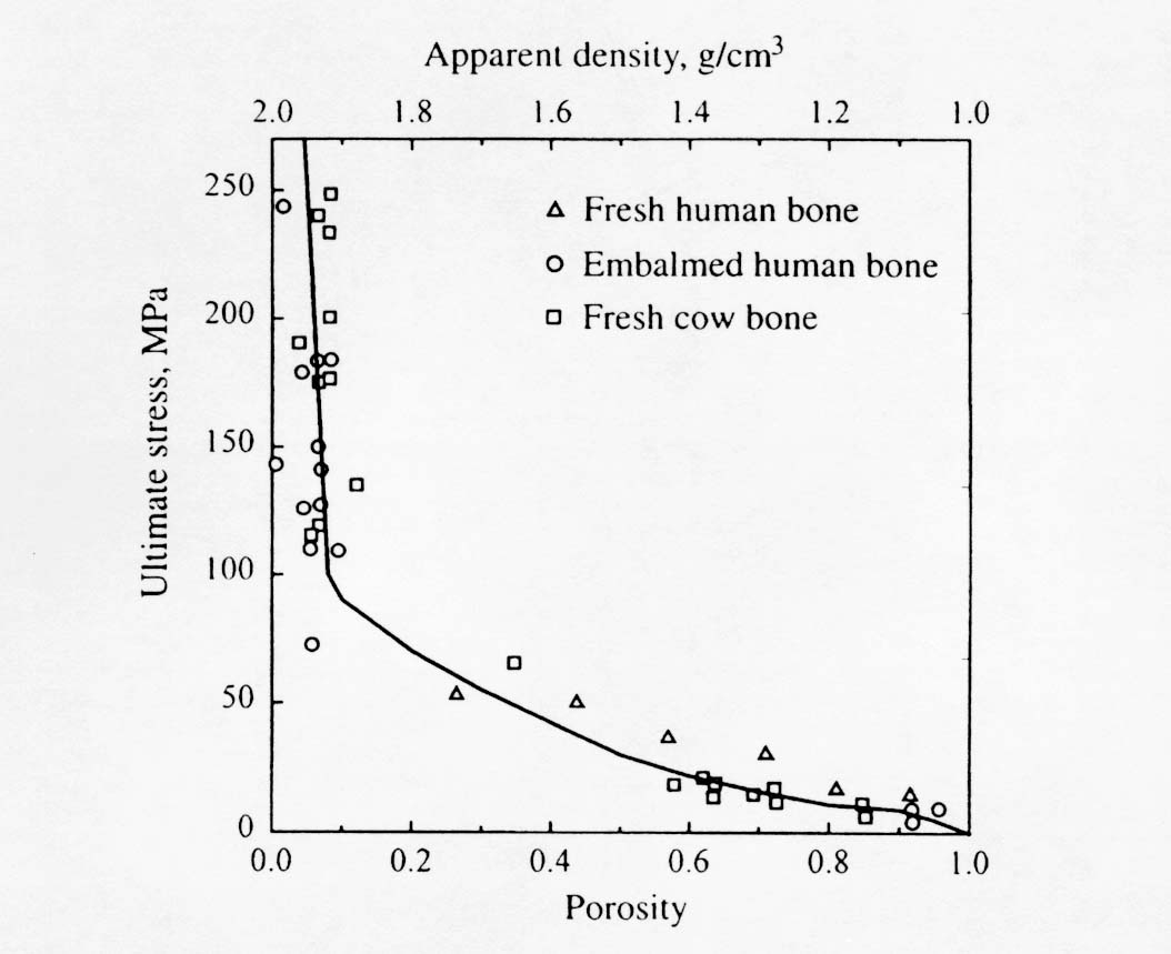 Note that Young's modulus is given in GPa and that the exponent on porosity is very large and nonlinear. This means that the moment one introduces porosity into bone, there is a large decrease in stiffness. The effect of ultimate stress on porosity is similar. Martin et al. (1998) present a composite graph showing multiple experiments relating ultimate stress to porosity: