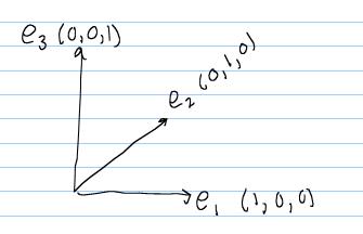 With this orthonormal basis coordinate system, we can then write any arbitrary vector as a linear combination of the basis vectors e1, e2, and e3, with the each component of the vector u in the e1, e2 and e3 direction as shown below: