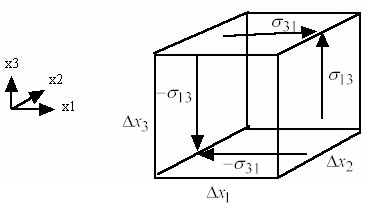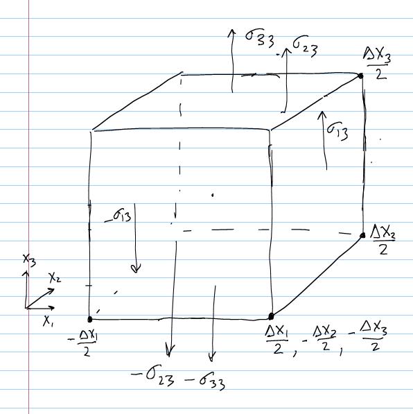 where the first two delta x terms are the area of the plane and the last term is the moment arm. We can now balance the moments in the x2 plane due to these shear stresses. It is important to note that on the innfinitesimal cube there are no externally applied moments (there are some continuum theories that assume moments at this level, but they are not widely used and are beyond the scope of these notes). Thus the balance of moments in the x2 direction leads to: