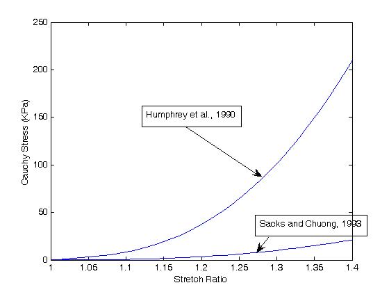 As another example, consider the experimental data from Sacks and Chuong (1993) tested regions of heart muscle from the right vetnricle. They used the same strain energy function as that derived by Humphrey. They obtained the following constants: