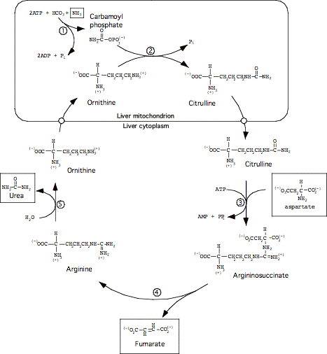 e. The urea cycle (only in liver) makes amine moieties into urea for excretion