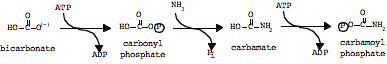 - one ATP spent to put the phosphate on CP, which drives the next reaction (formation of citrulline; OTC)