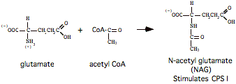 - The CPS step is allosterically stimulated by N-acetyl glutamate (formed by the enzyme N-Acetyl Gluamate Synthetase [NAGS], in mitochondrial matrix).