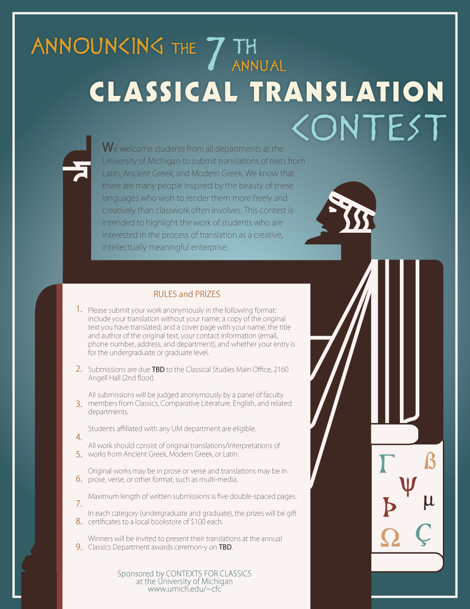 We know that there are many people inspired by the beauty of these languages who wish to render them more freely and creatively than classwork often involves. This contest is intended to highlight the work of students who are interested in the process of translation as a creative, intellectually meaningful enterprise. We welcome students in Classics and other languages and literatures as well as creative writers and students interested in translating Greek and Latin into other media, such as music, the visual arts, screen arts, theater, dance, etc.