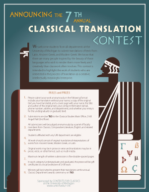 Faculty in all departments are encouraged to announce this contest to their classes. We invite graduate students to inform their own undergraduate language and writing classes about this contest, and to enter it themselves.There will be two categories of contestants: undergraduate students and graduate students. Prizes will be given in each category for the first, second, and third place winning entries of original translations from the languages of Greek or Latin of any era. Winning authors will have the opportunity to present their translations and receive their prizes at the annual Classics awards ceremony.