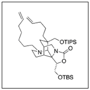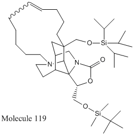 A 5-L 3-neck round bottom flask was used. A reflux condenser and a straight tube adaptor with an in-line Teflon screw seal were attached to the flask. A septum was fitted to the straight tube adaptor and a gas flow adaptor was placed atop the reflux condenser. A gas dispersion tube was also attached. The flask was charged with methylene chloride (2.4 L) and diene 118 (416 mg, 0.59 mmol). Then the solution was sparged for 1 hour with a flow of argon through the gas dispersion tube. The solution was then heated to reflux and a solution of catalyst 121 (24.3 mg, 0.030 mmol) in methylene chloride (11 mL) was added in one portion through the septum, and the Teflon screw was firmly sealed to avoid contact of the solvent vapor with the rubber septum. The solution was under reflux for 8 hours under a flow of argon, and DMSO (400 µL) was added. The solution cooled to room temperature over 12 hours. Then the solvent was evaporated under reduced pressure. The residue was purified by flash chromatography on silica using a gradient solvent system (1:99 EtOAc:benzene; then 5:95 EtOAc:benzene) to provide macrocycles 119 as slightly yellow (2:1 mixture of E and Z isomers).