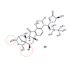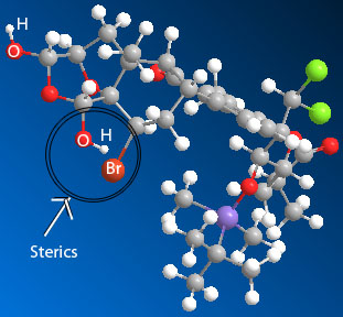 "HOLLY. Get away from that! We're trying to go undetected here!" Despite Kari's quick admonishment, it was too late. With a thunderous CRASH, Eric and Kari turned to see Holly standing meekly by a broken beaker. "Uhmmm.... it wasn't me?" she suggested timdly. "Hahahah... awwwwwhhh," giggled Eric, amused by Holly's klutziness. "Yeah, it's a long story," explained Kari. "Well, whatever. MUAHAHA. I have you now! There's no hope for escape!" recovered Blofeld, stroking his white Persian cat, Mrs. Whiskers. "Bring them to control room so that they can see my master plan in action!" **Note: This is not meant to suggest that Tony is prone to rambling. We actually think that Tony is an excellent USI and gives very clear and helpful explanations. To any other 215/216 students reading this: Don't tune out Tony. Really. (Also: thanks for agreeing to be our villian, Tony!) Provide a brief explanation for the observed regioselective reduction This reaction uses BF3•Et2O in combination with Et3SiH to reduce one, but not both, of the hydroxyl groups of 55. This regioselection occurs due to the sterics hinderance of one of the groups. The selected OH group is less sterically hindered than the other due to the 3D shape of the seven-membered ring on which it is a substituent. The hydroxyl group that is closest not reduced is sterically hindered by the large size of the nearby bromine atom. This prevents the approach of the bulky boron trifluoride etherate adduct as well as the bulky triethylsilane that donates the hydride after the formation of the double bond. ![]() ![]() |