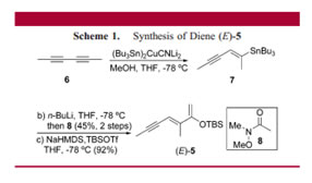 Kong, K.; Moussa, Z.; Romo, D. Org. Lett. 2005, 7, 5127-5130. "In Ke Kong's journal article, Kong explains his ambition to discover an enantiosynthesis of the spirocyclic imine (-)-gymnodimine (a marine toxin) in order to provide modern antigens to monitor and eliminate it. Preliminary trials to promote this Diels-Alder enantioselective reaction failed with the diene (Z)-silylenol ether due to a lack of reactivity, even in the presence of chiral catalysts. This failed reactivity was most likely attributed to geometrical issues so the synthesis of the diene (E)-silylenol ether (which is our product 24) was pursued. In the first step for (E)-silylenol ether's synthesis, (E)-vinyl stannane was used as a starting material rather than other radical and metal-catalyzed hydrostannylations because its regioselectivity was more stable and therefore formed the final (E)- silylenol ether. (E)-vinyl stannane goes through tin-lithium exchange with n-BuLi followed by a reaction with the amide N-methyl-N-methoxyacetamide in order to form the ketone (which is our intermediate S-6). This essentially describes the first step for the formation of (E)- silylenol ether; the ketone continues through enolization and silyation to form (E)- silylenol ether.