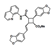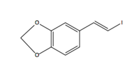 Molecule 14 (480 mg, 1.19 mmol), Pd(OAc)2 (40 mg, 0.18 mmol, 0.15 eq), AgOAc (298 mg, 1.78 mmol), and 3,4-(methylenedioxy)styrenyl iodide (2.62 g, 10.56 mmol, 3 eq) were mixed in a tube. Under ambient conditions, 5.9 ml of toluene (0.2 M) was added, the tube was sealed, and placed into an oil bath for 10 hours at 80 oC. The solution was cooled to room temperature and DCM (10 ml) was added. The solution was filtered through celite and concentrated under vacuum. Silica gel chromatography (3% to 4 % Ethyl acetate in toluene) purified the orange oil, giving molecule 16 (386 mg, 59%) as yellow foam.