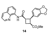 A: The reaction with the Pd catalyst at the C-H bond is more stable in the transition state that contains the very bulky substituents in an anti-position, because of sterics. This suggests that in order for the C-H bond to be cleaved, there must be a minimum dihedral angle between the C-H bond and the Pd-OAc bond that exists in the transition state. This transition state subsequently allows the reaction to continue, thus forming the single diastereomer in our product 16.
