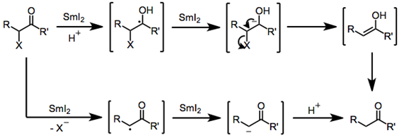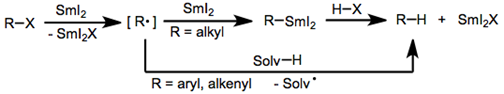 Samarium (II) iodide (SmI2), also known as Kagan’s reagent, is a mild one-electron reducing agent that is often used in the reduction of various classes of organic molecules. This reagent is used to reduce a wide variety of molecules, but more commonly used in the reduction of organic halides and α-functionalized carbonyl compounds. Reactions with SmI2 occur through electron transfer with the reactant, followed by proton transfer from a protic solvent. This causes mechanisms containing SmI2 to contain radical intermediates as well. Reduction of an Organic Halide using SmI2