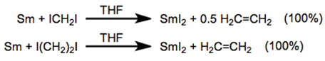 In the preparation of SmI2, samarium metal reacts with either diiodomethane or diiodoethane to produce SmI2. However, diiodomethane is preferred because it is a liquid. Pure SmI2 is air sensitive but in solution it can be manipulated without special precautions because it reacts very slowly with water and alcohol.