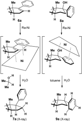 | In this article, the authors studied two ways of using Raney’s nickel to selectively choose the stereochemistry of a phenyl group attached to the D ring of aryl steroids. As can be seen in Figure 1, when Raney nickel reduced a double bond connected to a phenyl group, the phenyl group ended up exclusively cis to the methyl group located on the same ring. However, when Raney nickel was used to remove an alcohol group cis to the methyl, the phenyl group ended up exclusively trans to the methyl. By using deuterium experiments, the researchers established that the hydrogens used to hydrogenate the double bond come from Raney nickel, not from one of the solvents. The authors propose that Raney nickel is able to so selectively determine the stereochemistry of the phenyl group because of the facial selectivity of the aryl steroid. As seen in Figure 2, the double bond cannot be reduced to make the phenyl group trans to the methyl because the methyl prevents bonding between the flat metal face and the double bond from this orientation. |