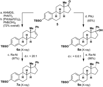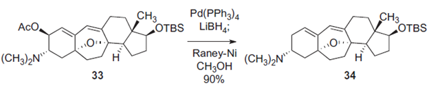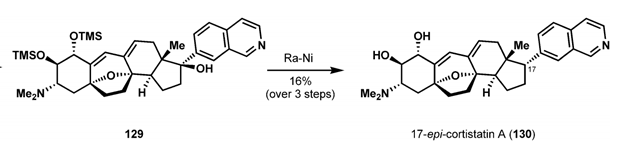 This article describes different approaches to synthesize the cortistatin family, cortistatin A, J, K, and L. The compounds within the family vary slightly by substituents on the A- and D-rings of the main steroidal skeleton. The author and colleagues specifically look to prepare the compounds from the single azido alcohol intermediate. While the synthesis of cortistatin K is more direct than cortistatin A, the author used Raney-Nickel on cortistatin K to reduce the C=O bond and add hydrogens. First, lithium borohydride and tetrakis(triphenylphosphine)-palladium regioselectively did reductive cleavage of the allylic C-O bond. Then, Raney nickel in methanol achieved decomplexation, or deformation of complex bonds. In this case, the decomplexation would be treated on the allylic C-O bond. Raney nickel here completed the bond reduction of cleaving C-O and forming C-H instead.