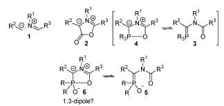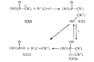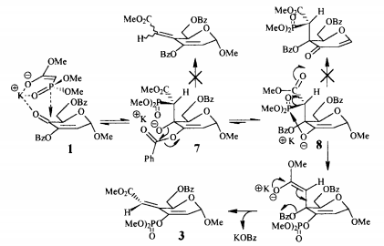 A key component of the transformation of molecule 3 to molecule 4 is the Horner-Wadsworth-Emmons reaction. This paper, written by Wadsworth and Emmons, details this mechanism in depth, in collaboration with ideas from a previous paper written by Emmons. In the first step of the reaction, a phosphonate anion adds to an aldehyde or ketone, forming an alkoxide intermediate. This intermediate is in equilibrium with a four-membered ring. The molecule then undergoes fragmentation yielding a phosphate anion and a newly formed double bond in the product. The paper discusses the benefits of using a phosphonate anion, because it reacts without reverse addition and can be used effectively with all ketones, even those that are sterically hindered. The phosphonate anion has three contributing resonance structures, giving the P=O bond some single bond character, which aid in its ability to react under mild conditions. The first step in the mechanism, where an aldehyde or ketone is added to the carbonyl group, yields an intermediate that is in equilibrium with a four-membered ring. These equilibrating structures then undergo fragmentation to yield the product and phosphate anion. Phosphonate anions can be used in conjunction with the Horner-Wadsworth-Emmons mechanism to yield a variety of different reaction products. For instance, they can react with alkyl halides to give α-substituted phosphonates, which will react with a hydride reagent and an aldehyde or ketone to give olefins, which is a type of synthetic fiber. Additionally, halogenation of a phosphonate anion with subsequent addition of an aldehyde or ketone will produce vinyl halides.