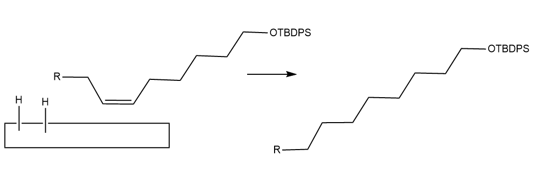 Hydrogenation is used to reduce organic compounds by exposing them to H2 in the presence of a metal catalyst. In this specific step, hydrogenation is used to reduce the alkene present in the molecule. A basic reaction scheme for this step is below: