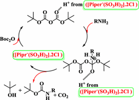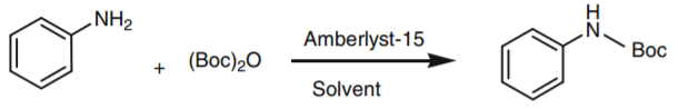 In this paper, researchers attempt to reproduce the results an earlier paper reported about a procedure for chemoselective mono-N-Boc protection of amino acids, amines, and peptides with a di-tert-butyl decarbonate. The reaction was catalyzed with Amberlyst-5 catalyst in ethanol, which can be used for both N-boc protection and deprotection. This experiment involved reacting aniline with 1.1 equiv (Boc)2O with the Amberlyst-15 catalyst present at room temperature. Protic solvents were found to be most effective, particularly ethanol, so it was used as the reaction solvent and generated a respectable yield. A solvent-free reaction was also done to test an earlier report that said this reaction would finish within 1-12 minutes, but results were not consistent with it because the time and experimental yield did not match it. In the reaction with ethanol solvent, no impurities, such as urea or N,N-di-Boc derivatives, were detected from TLC and H1 NMR analyses—a good result. Amines reacted well to give outstanding yields of N-boc products. The researchers concluded that this procedure, taking place at room temperature in ethanol solvent with easily recoverable Amberlyst-5 catalyst, is an efficient procedure for N-tert-butoxycarbonylation of various types of amines.