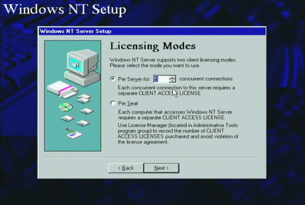 You are allowed to specify the number of users your license covers. There are two ways of licensing NT. You can either license a number of connected users or have a license for each system ("seat") connected to any NT server. The first choice makes most sense for a standalone server like a web server. The second choice makes the best sense for a large enterprise-network.
