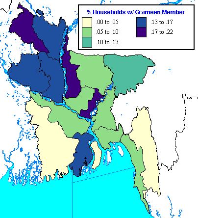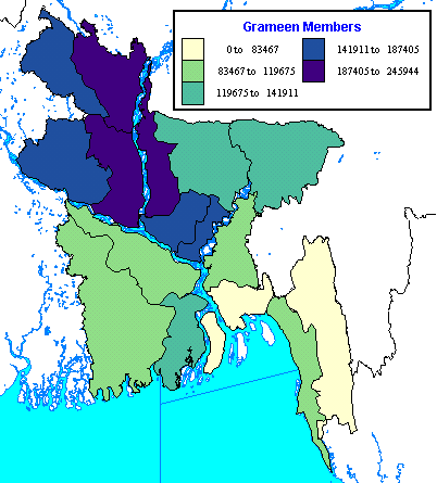 In 1991, Yunus decided to slow the growth of Grameen's membership and focus instead on expanding the variety of services Grameen provides for its members. This slowing of growth is understandable when one estimates the reach of the Grameen Bank into its target population. The organizational structure he designed for Grameen accomodates up to 2,700,000 members but is now almost at full capacity (1998 membership is 2,322,736). Grameen already averages more than one center per village in almost half of the zones in which it operates (but see note above). On average, there are almost two Grameen centers for every three villages. The Grameen Bank has reached a critical mass of members, and it cannot continue its growth indefinitely.