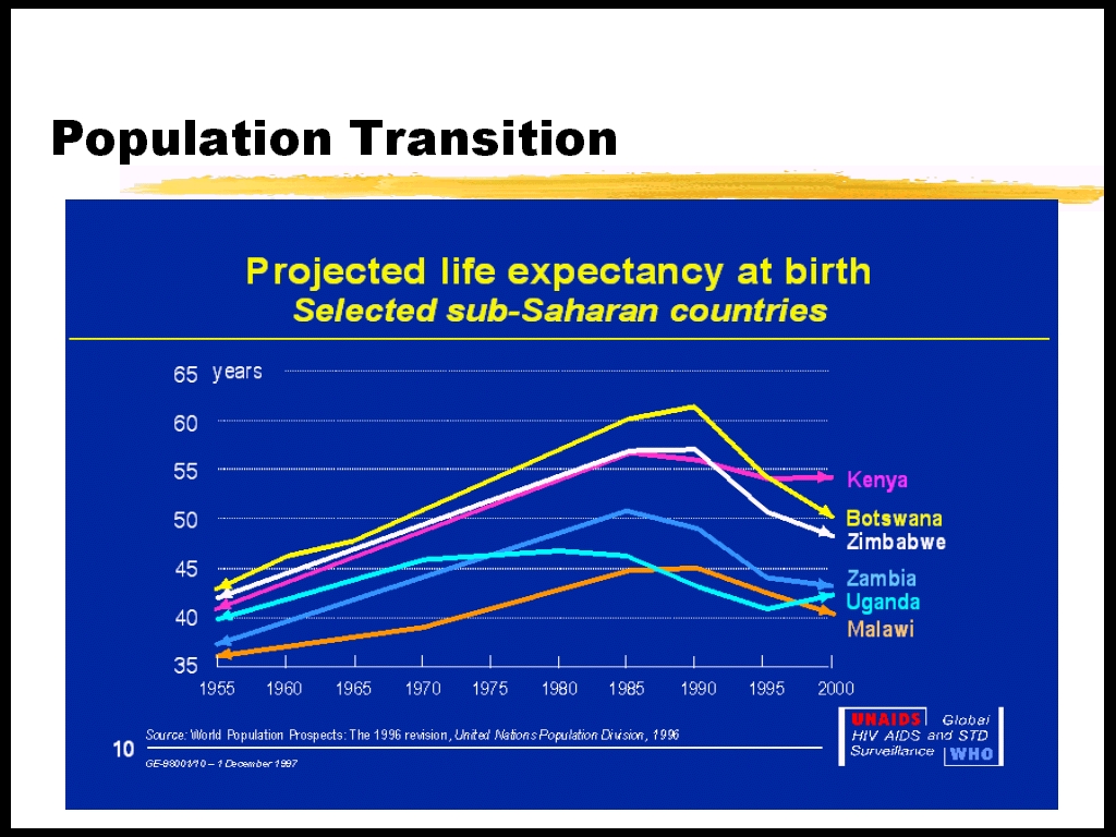 This data highlights two points. First, it shows the interrelatedness of the epidemiological and population transitions. Second, this highlights the instability of the exponential growth phase of any transition. Exogenous events, occurring at an inappropriate time, can alter the course of a transition and make the future more uncertain. It will be necessary to revise current estimates of population in the future as epidemiological models change and the direct and indirect effects of HIV/AIDS mortality is taken into account.