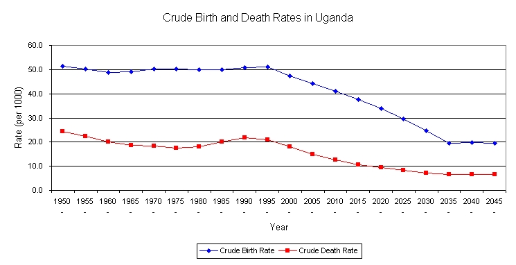 The HIV/AIDS epidemic, occurring at such a volatile time in the population transition of Uganda, threatens to make a drastic effect on the outcome. With such a high mortality rate associated with this disease, there is bound to be an effect on the future population, both on numbers and on growth rate. Current estimates are that Uganda will face an additional 1.5 million deaths directly due to AIDS by 2025. (United Nations Population Division, 1996) The total effect on population is therefore the object of many studies, in hopes of coming up with a more accurate estimate of the population transition. One of these studies (Low-Beer, 1997) looked at the effects of HIV/AIDS mortality on the demography of Uganda, in particular the Rakai district.