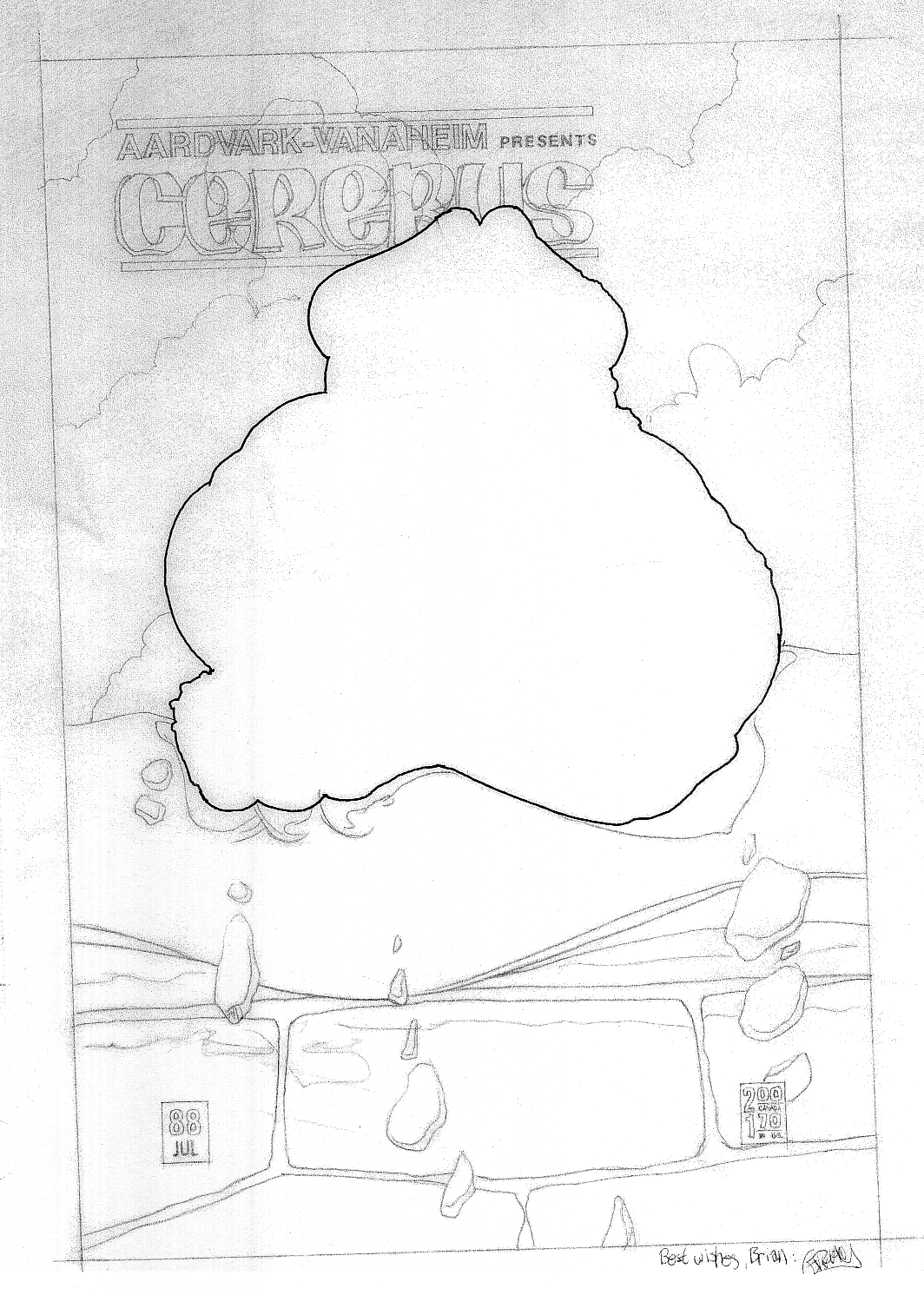 It also came with an onionskin overlay of Ger's pencils that were transferred to the drawing board, and the big blank space for Dave to do the Cerebus drawing. Note the note: "(possibly the only cover recreation with Gerhard lettering)(so far anyhow)" Well, that would be another 'first,' eh?