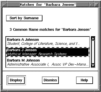 After performing a search, if there is more than one match, an Entry List window is presented to the user. The user can select an entry to display by double-clicking on the desired entry, or by highlighting it and clicking the "Display" button or pressing Return.