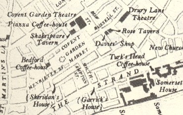 This detail shows two of the three patent theatres, Covent Garden and Drury Lane. Most theatrical energy was centered in this area; the Little Theatre in Haymarket is near Picadilly Circus, not pictured here. For a larger map and more extensive topographical information, click here.