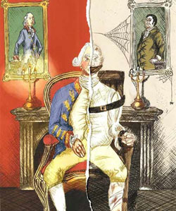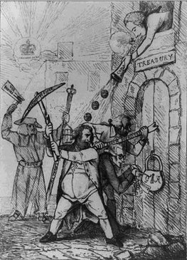 During his reign from 1760 - 1820, King George III became the model for the “perfect Englishman” in the latter half of the eighteenth century. From the beginning of his reign, he exhibited desirable qualities of self-discipline, composure and temperance. However, in 1788-89, he fell ill, both mentally and physically. The King’s madness posed a threat to the state’s stability and thus became a popular theme in many representations. His madness was associated with a loss of reason and as the eighteenth century was the Age of Reason, this unreason was undesirable. However, the public was sympathetic of the King’s illness and celebrated the King’s recovery. This is evident in the caricature “House-Breaking, before Sun-Set,” which at first glance seems to depict only the political instability at the time. However, a closer analysis reveals a crown with “Obscured, not Lost” in the background to suggest that there is hope for order once again 13.