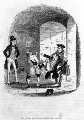 38 The picture shows a man being forcefully removed by two other men while pointing a finger at a fourth man saying "I'm not the lunatic, that is the lunatic."