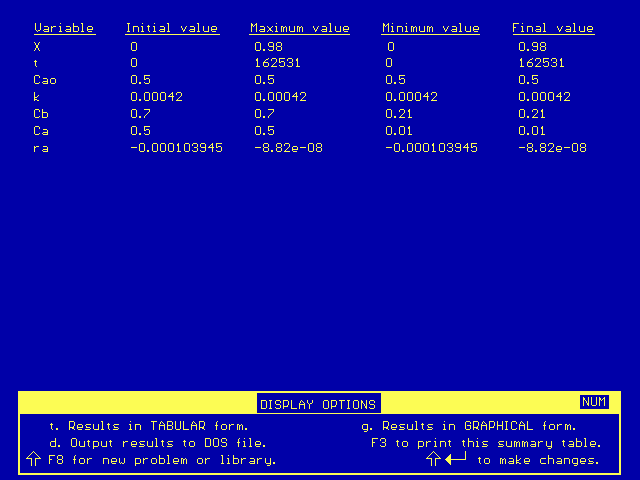 After Polymath solves the equations, it gives a chart of initial, maximum, minimum, and final values: