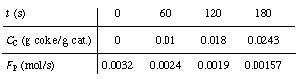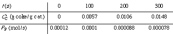 When the decomposition of cumene was carried out over a LaY zeolite catalyst, deactivation of the catalyst was found to occur by coking. The reaction is first-order and was carried out in a differential reactor containing 1 g of catalyst at 430°C [Ind. Eng. Chem. Process Des. Dev., 22, 609 (1983)]. The exit molar flow rate of propylene was monitored as a function of time. (a) From the data below, determine the decay functionality,