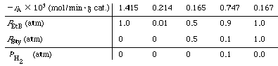 3 , 2% KOH) in a differential reactor [Ind. Eng. Chem. Process Des. Dev. 4, 281 (1965)]. It was observed that the rate of reaction was decreased when styrene was added to the feed stream. Initial rate data showed that as the partial pressure of ethylbenzene was increased to moderate values, the rate of reaction became independent of the partial pressure of ethylbenzene. However, the rate of reaction was also decreased when styrene and hydrogen were formed. The equilibrium constant K p was taken to be 0.415 atm at 630°C. Suggest a mechanism that is consistent with the experimental observations and derive the corresponding rate law. Using the information from the following table, taken at T = 630°C |