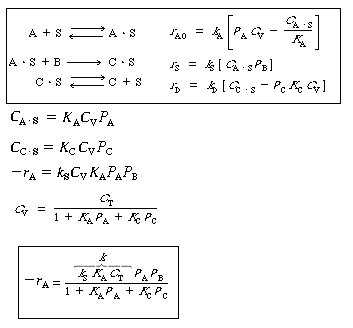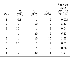 | are shown below. The limiting step in the reaction is known to be irreversible, so that the overall reaction is irreversible. The reaction was carried out in a differential reactor to which A, B, and C were all fed. | ||