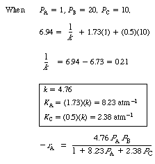 Solution(a) Compare runs 1, 3, 6, and 7. P B and P C are fixed. As P A increases the rate first increases then levels off. Therefore, P A must be in both the numerator and denominator.