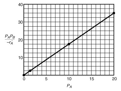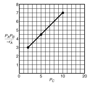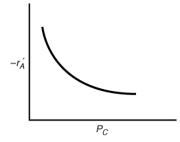 (d) Evaluate the rate law parameters. (e) From your rate expression, which species can you conclude are adsorbed on the surface? (f) From your conclusions in part (e), suggest a mechanism and rate-limiting step for this reaction. (g) For an entering partial pressure of A of 2 atm in a PBR, what is the ratio of sites of A to C sites at 80% conversion of A? (h) At what conversion are the number of A and C sites equal? |