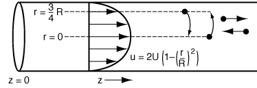 | The question now arises: What would happen if some of the molecules traveling on the streamline at r = 3R/4 jumped (i.e., diffused) to the streamline at r = 0? The answer is that they would exit sooner than if they had stayed on the streamline at r = 3R/4. Analogously, if some of the molecules from the faster streamline at r = 0 jumped (i.e., diffused) to the streamline at r = 3R/4, they would take a longer time to exit (Figure R14.1-1). In addition to the molecules diffusing between streamlines, they can also move forward or backward relative to the average fluid velocity by molecular diffusion (Fick's law). With both axial and radial diffusion occurring, the question arises as to what will be the distribution of residence times when molecules are transported between and along streamlines by diffusion. To answer this question we will derive an equation for the axial dispersion coefficient, D a , that accounts for the axial and radial diffusion mechanisms. In deriving D a , which is referred to as the Aris-Taylor dispersion coefficient, we closely follow the development given by Brenner and Edwards. 1 | |||